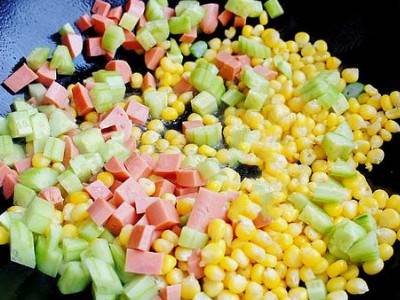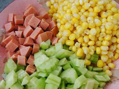 玉米粒解冻清洗干净;黄瓜去皮洗净切丁,火腿肠去皮切丁,葱姜切碎。