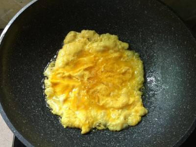 鸡蛋磕入碗中,加料酒打成蛋液,下锅炒熟盛出。
