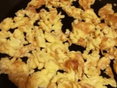 鸡蛋打进碗里,加盐搅匀后下锅炒熟,盛出备用。