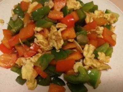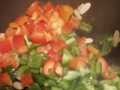 菜椒洗净切丁,锅热倒油,下入菜椒丁大火翻炒至断生。