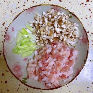 2. 肉切小粒、香菇切小粒,葱切葱花备用。