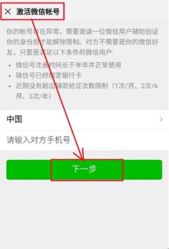4. 根据“激活微信账号”页面提示,输入一个符合要求用于“辅助验证”操作的好友微信手机号后,点击“下一步”(如图所示)。