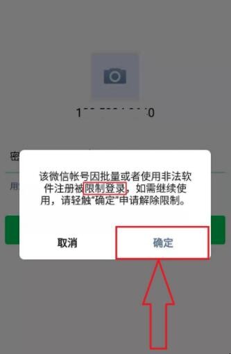 1. 在手机打开微信应用程序,在进行登录时,后台弹出“登录限制”的异常提示(如图所示)。点击弹出提示框中“确定”,进行“申请解除限制”操作。
