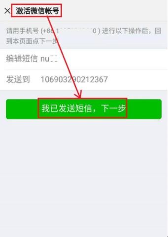 3. 根据“激活微信账号”页面提示,发送指定短信信息到指定号码后,点击“下一步”(如图所示)。