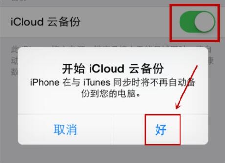 4. 在备份界面,找到“iCloud云备份”选项,点击打开,在新弹出的窗口中选择“好”选项。