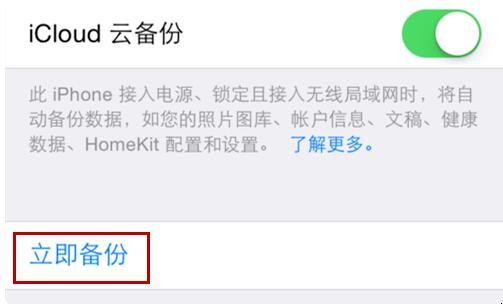 5. 找到“立即备份”选项,点击打开即可答运行iCloud云备份功能。在另新的苹果手机重复同样的操作步骤,即可完成数据转移到新苹果手机。