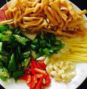5. 萝卜干切段,杭椒和小红辣椒滚刀切、大蒜拍碎切颗粒,姜切丝、青蒜切小段。