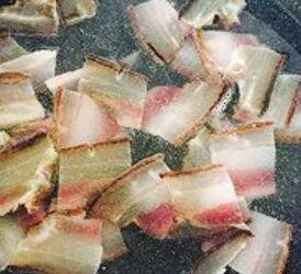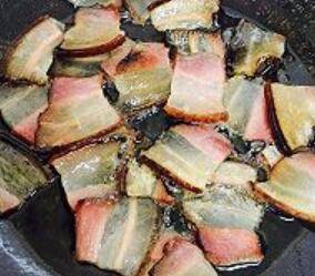 6. 油下锅,将沥干水分的腊肉完全煸出油,然后捞起,装盘备用。
