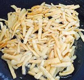 8. 煸香大蒜后,放下萝卜干,不停翻炒,直至萝卜干水分完全干透。