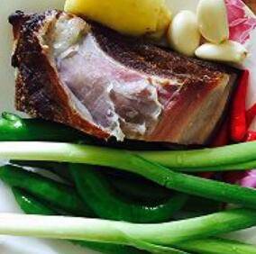 2. 腊肉,杭椒、小红辣椒、大蒜、青蒜、姜。