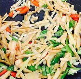 9. 炒至萝卜干焦黄,放下小红辣椒,翻炒十秒,放下杭椒,姜丝、腊肉、继续翻炒,中途加入适量的酱油和生抽、青蒜、翻炒两至三分钟,放点鸡精提味。