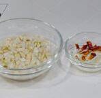2. 泡发好的萝卜干切成小丁,葱切葱花,辣椒掰成小段。