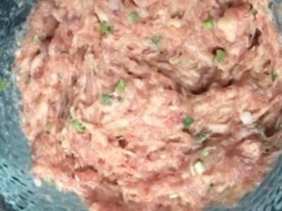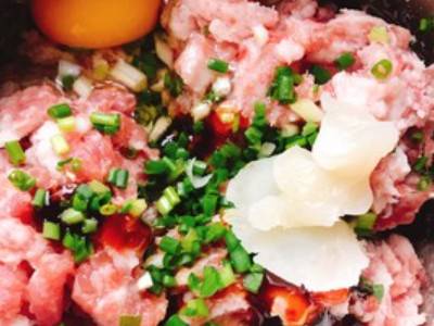 搅碎的猪肉加入盐、生抽、蚝油、食用油、猪油、葱、鸡蛋搅上劲。