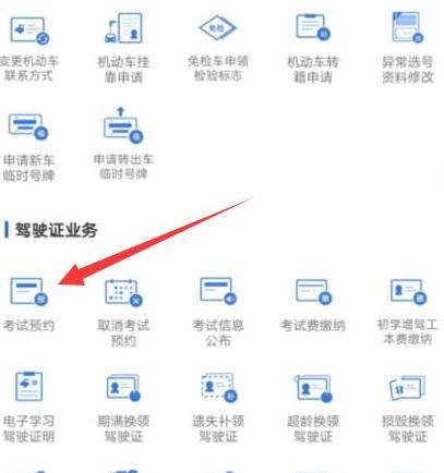 4. 向下滑找到驾驶证业务,点击考试预约。如果你已经通过考试,系统就会显示该科目已考试合格,无需预约。如果能点进去预约,则证明没有通过考试。