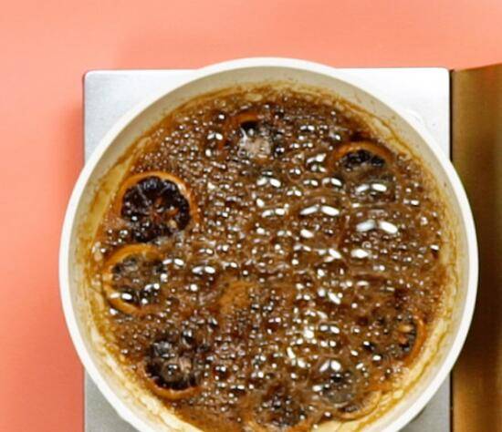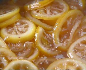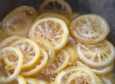 直到糖水变得很浓稠,把柠檬片取出来。